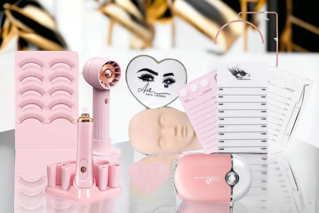 Kit mini troler roz cu spuma de gene Aria, perie de curatare si periuta mascara