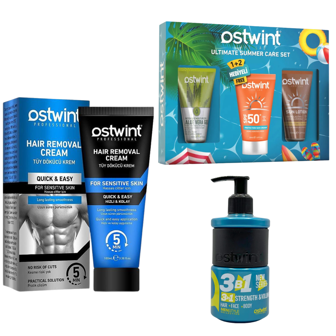 Set Crema depilatoare pentru piele sensibila Ostwint - 100ml (barbati), Gel de dus 3 in 1 Strenght & Volume 250ml ,Crema de protectie solara 50+ SPF Ostwint - 100ml